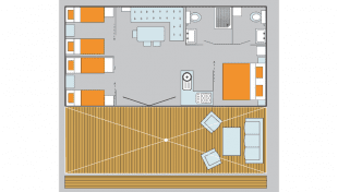 Le nostre case con 3 camere da letto sono i modelli più grandi, dotati di un soggiorno molto spazioso, accogliente e luminoso, con una doppia portafinestra che si apre direttamente sulla veranda in legno parzialmente coperta. La casa dispone di: un bagno con doccia, WC separato, una camera matrimoniale e due camere doppie. Cuscini e piumini sono già in dotazione; dovete portare solo le lenzuola, le federe e la biancheria da bagno, oppure potete noleggiarle da noi.