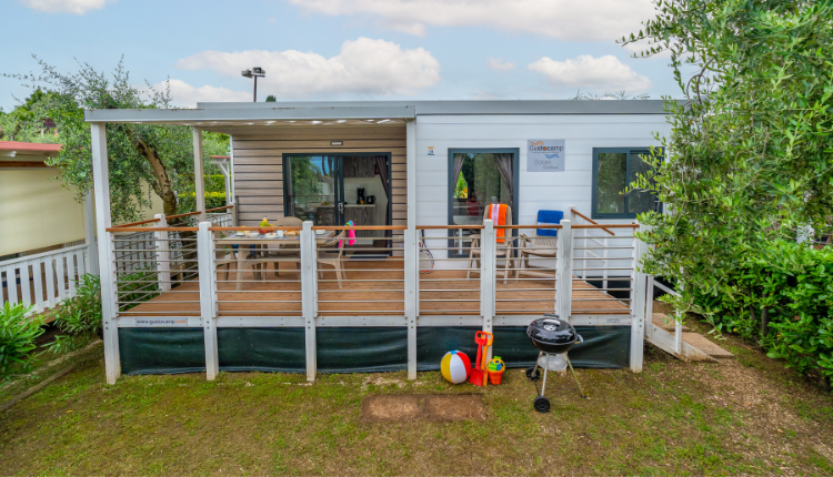 Il Solare Deluxe offre lusso per 5 persone. Questa casa mobile dispone di 2 camere da letto, ampio spazio per riporre gli oggetti e una cucina completamente attrezzata con frigorifero alto e piano cottura a gas a 4 fuochi. Sul davanti si trova una terrazza in legno con tettoia parziale, ideale per godersi le ore più calde o in caso di pioggia.