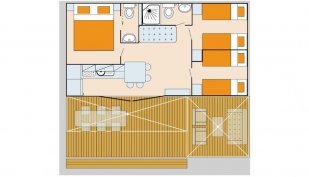 Questa lussuosa casa mobile dispone anche di aria condizionata e di un'ampia terrazza in legno con un comodo salotto e una tettoia, ideale per rilassarsi all'aperto nelle ore più calde della giornata.