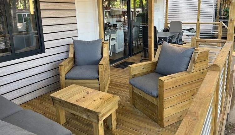 La casa mobile dispone anche di una comoda terrazza in legno completamente coperta con set da salotto, per godersi l'aria aperta in qualsiasi condizione atmosferica. L'aria condizionata offre un comfort extra e può essere utilizzata anche per il riscaldamento a inizio e fine stagione.