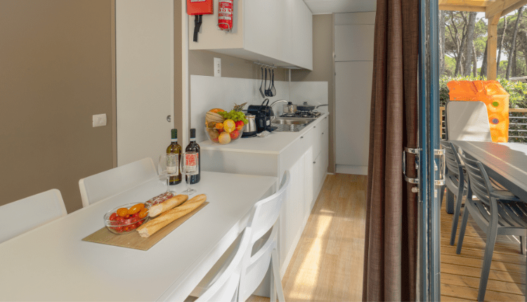 La spaziosa casa mobile Gran Lounge Deluxe XL è ideale per famiglie numerose o coppie che viaggiano insieme, grazie alla terza camera da letto aggiuntiva. La casa mobile offre un ampio soggiorno e una cucina a pianta aperta. La moderna cucina è completamente attrezzata e include un piano cottura a gas a 4 fuochi, un forno a microonde, un frigorifero con congelatore e una macchina per il caffè.