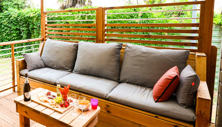 Terrazza in legno coperta con mobili da giardino e barbecue