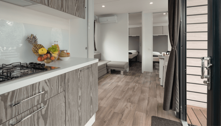 Il Solare Deluxe offre lusso per 5 persone. Questa casa mobile dispone di 2 camere da letto, ampio spazio per riporre gli oggetti e una cucina completamente attrezzata con frigorifero alto e piano cottura a gas a 4 fuochi. Sul davanti si trova una terrazza in legno con tettoia parziale, ideale per godersi le ore più calde o in caso di pioggia.