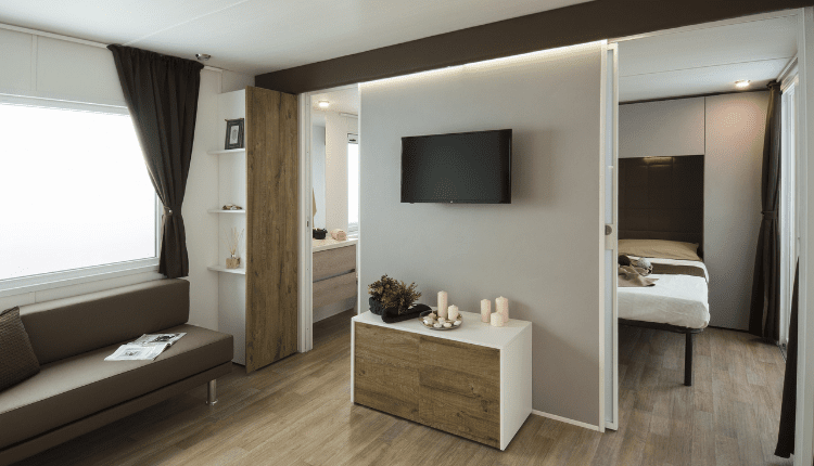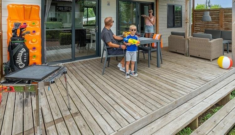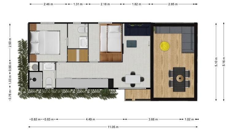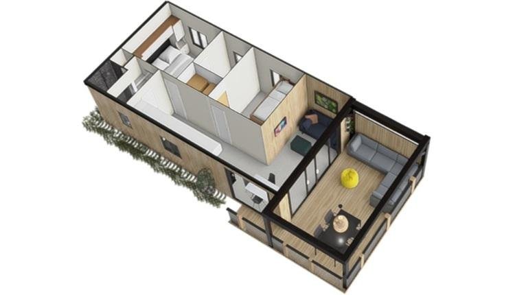 La casa mobile Gusto Fusion è la scelta ideale per le famiglie che cercano spazio, comfort e lusso durante le loro vacanze. Questa nuova casa mobile offre due spaziose camere da letto, una moderna cucina a pianta aperta e un ampio e luminoso soggiorno. Le lussuose porte scorrevoli si aprono direttamente sull'ampia terrazza in legno (semi-)coperta, dove interni ed esterni si fondono perfettamente. Che viaggiate con bambini piccoli o adolescenti, tutta la famiglia potrà godersi una vacanza rilassante e spensierata nella Gusto Fusion.