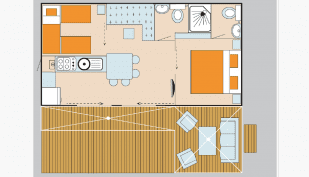 La Lounge Deluxe è una popolare casa mobile di lusso con 2 spaziose camere da letto, grandi finestre e lussuose porte scorrevoli. La casa mobile offre un ampio soggiorno e una moderna cucina a pianta aperta con piano cottura a gas a 4 fuochi, frigorifero alto, macchina Nespresso e microonde. Dal soggiorno e dalla cucina si accede alla terrazza del salone.