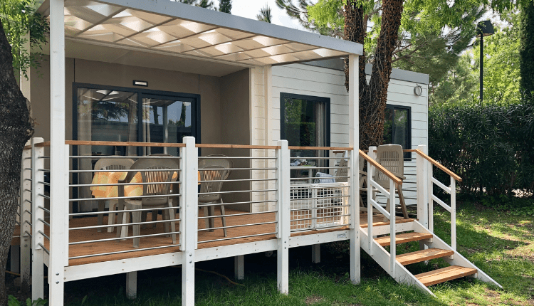 Il Solare Deluxe offre lusso per 5 persone. Questa casa mobile dispone di 2 camere da letto, ampio spazio per riporre gli oggetti e una cucina completamente attrezzata con frigorifero alto e piano cottura a gas a 4 fuochi. Sul davanti si trova una terrazza in legno con tettoia parziale, ideale per godersi le ore più calde o in caso di pioggia.