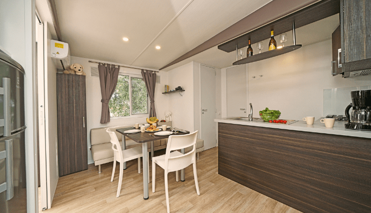 Questa è la più grande delle nostre case mobili, ha un ampio, accogliente e luminoso soggiorno, grazie alla doppia portafinestra che si apre direttamente sulla terrazza in legno coperta.