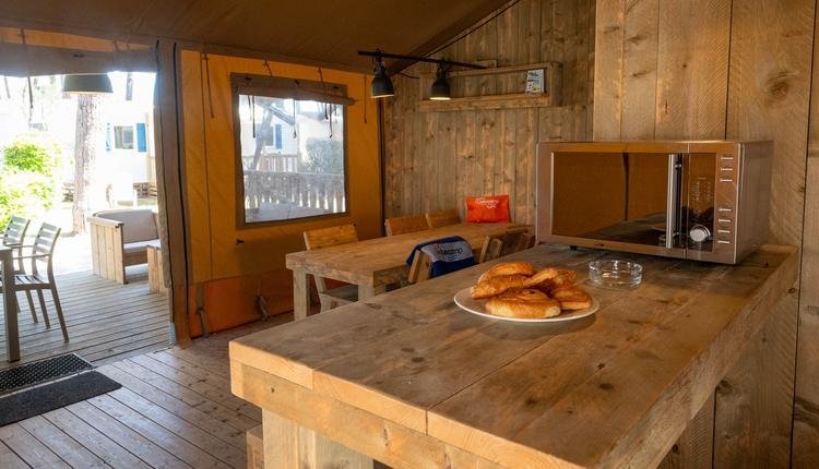 Le nostre tenda Safari Gusto Premium sono complete del nostro kit Deluxe, con eleganti calici per il vino, un forno a microonde e la macchina da caffè Nespresso.