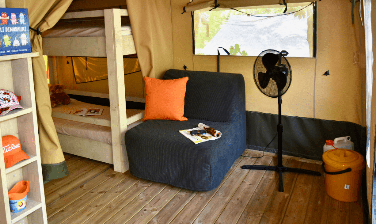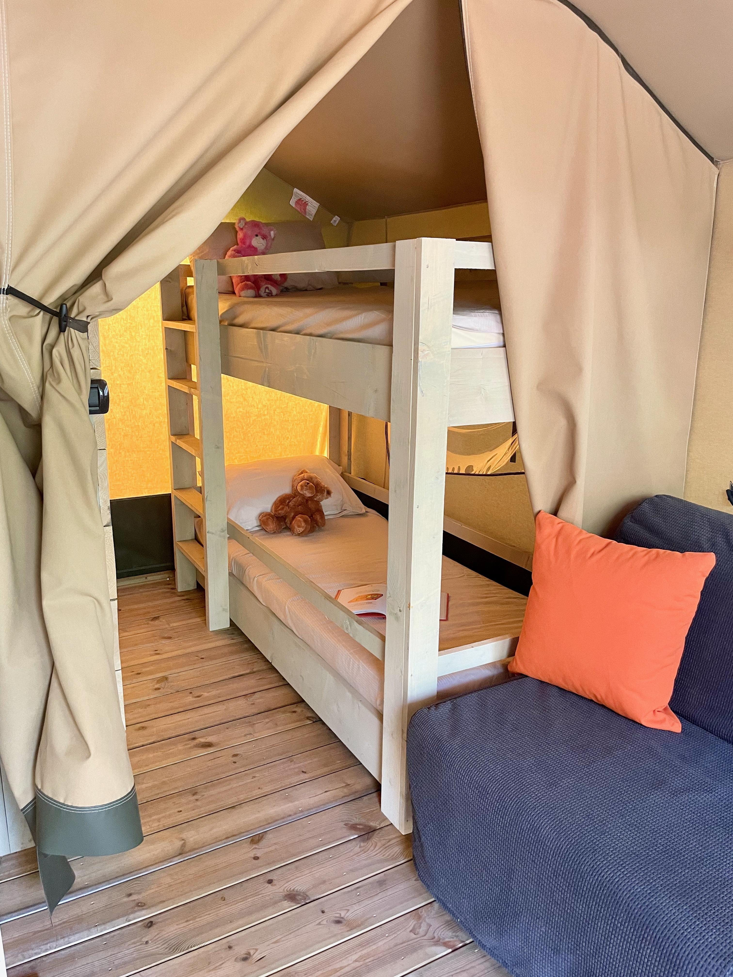 Camere da letto: la tenda safari dispone di camere da letto alte con letti confortevoli e buoni materassi. Non manca lo spazio per l'armadio e vengono forniti anche piumoni e cuscini. La 1ª camera della tenda safari ha un letto matrimoniale, la 2ª camera ha un letto a castello. Il soggiorno dispone di un divano che può essere trasformato in un comodo letto singolo.