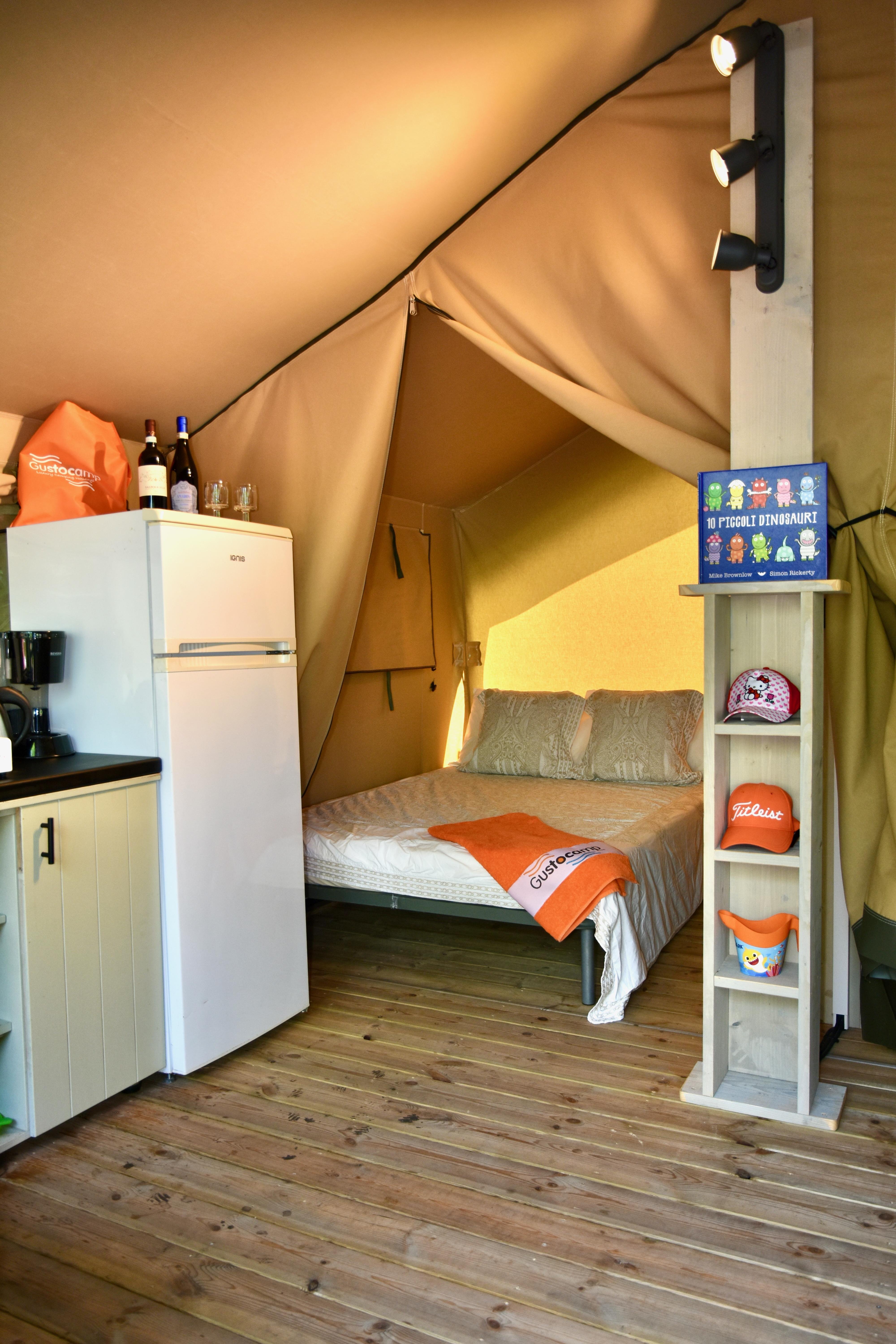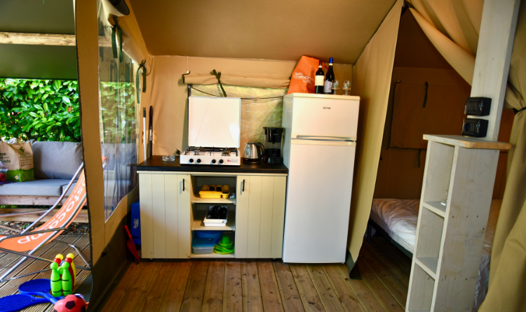 Zona giorno: Nella zona giorno della tenda safari Gusto, avrete accesso a una cucina completa con armadietti con serratura per i vostri alimenti, un fornello a gas a 4 fuochi e un frigorifero alto con scomparto congelatore. L'inventario della cucina della tenda comprende anche una macchina per il caffè, che potrete gustare in veranda.