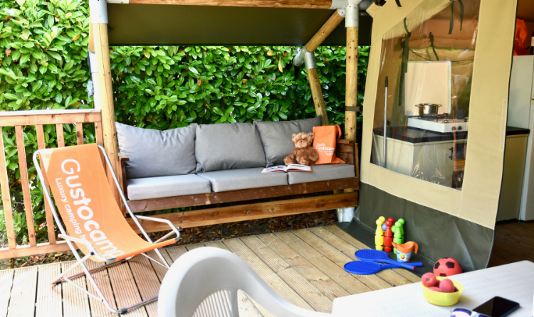 Terrazza: davanti alla tenda safari Gusto vi aspetta un set completo di mobili da giardino con un tavolo da giardino, 4 comode sedie da pranzo e 2 sedie alte regolabili. Inoltre, tutte le tende sono dotate di una panca per il relax. Naturalmente, il barbecue in loco fa parte del pacchetto. L'illuminazione esterna consente di leggere un libro davanti alla tenda anche di sera o di giocare con la famiglia.